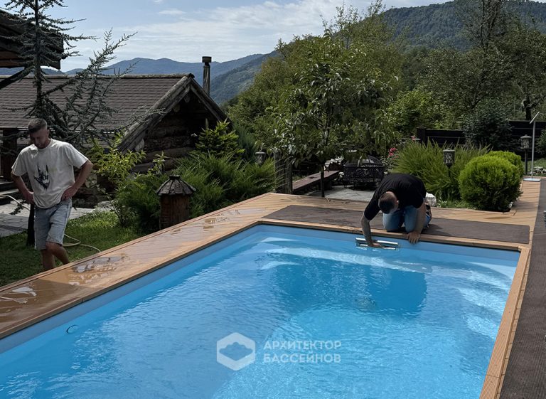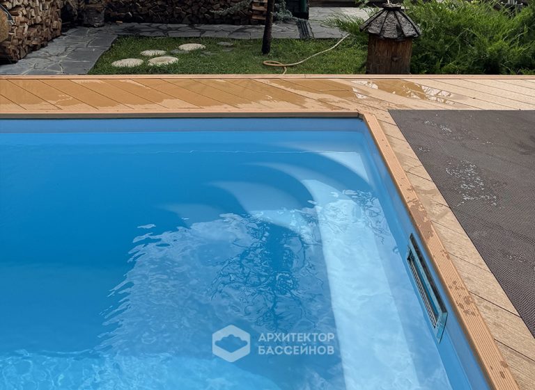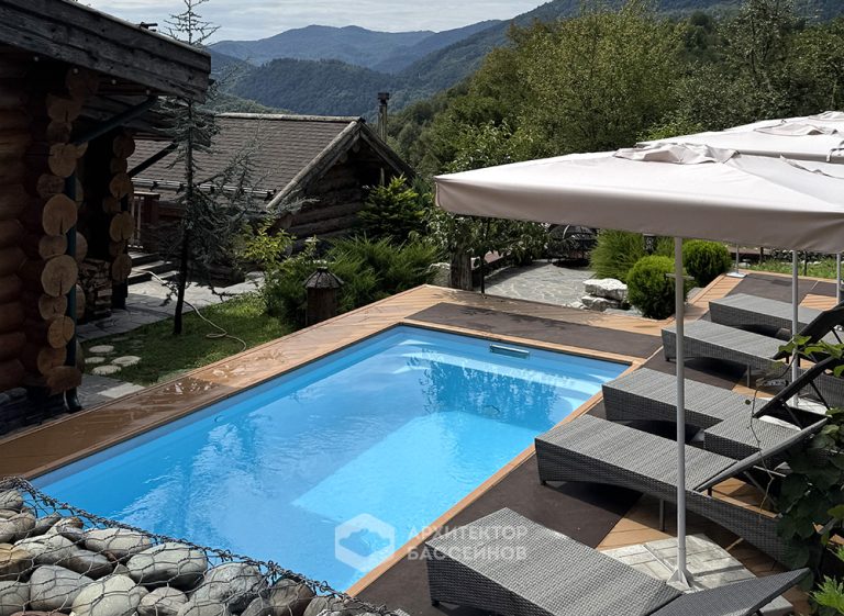 Отделка мозаикой и террасной доской, организована зеленая зона.