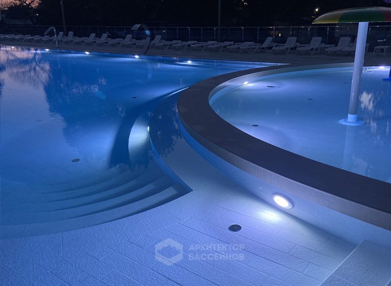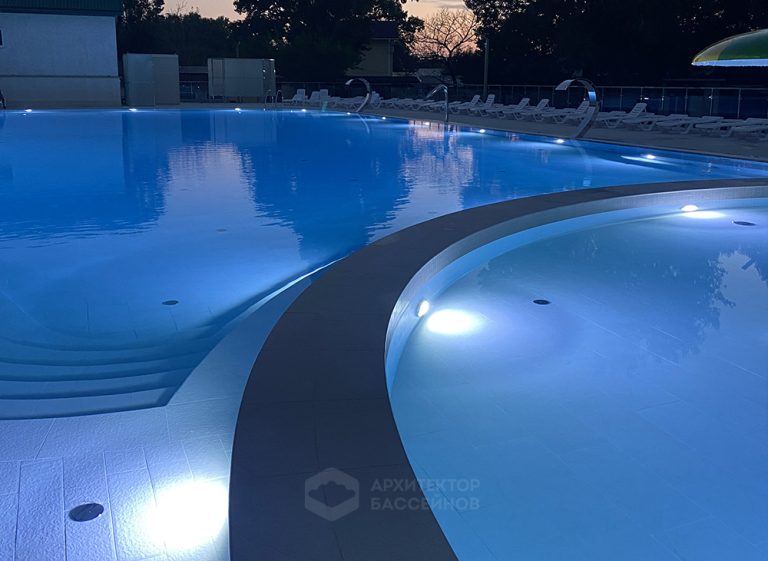 Бассейн бетонный, сложной формы по индивидуальному проекту, облицован плиткой.